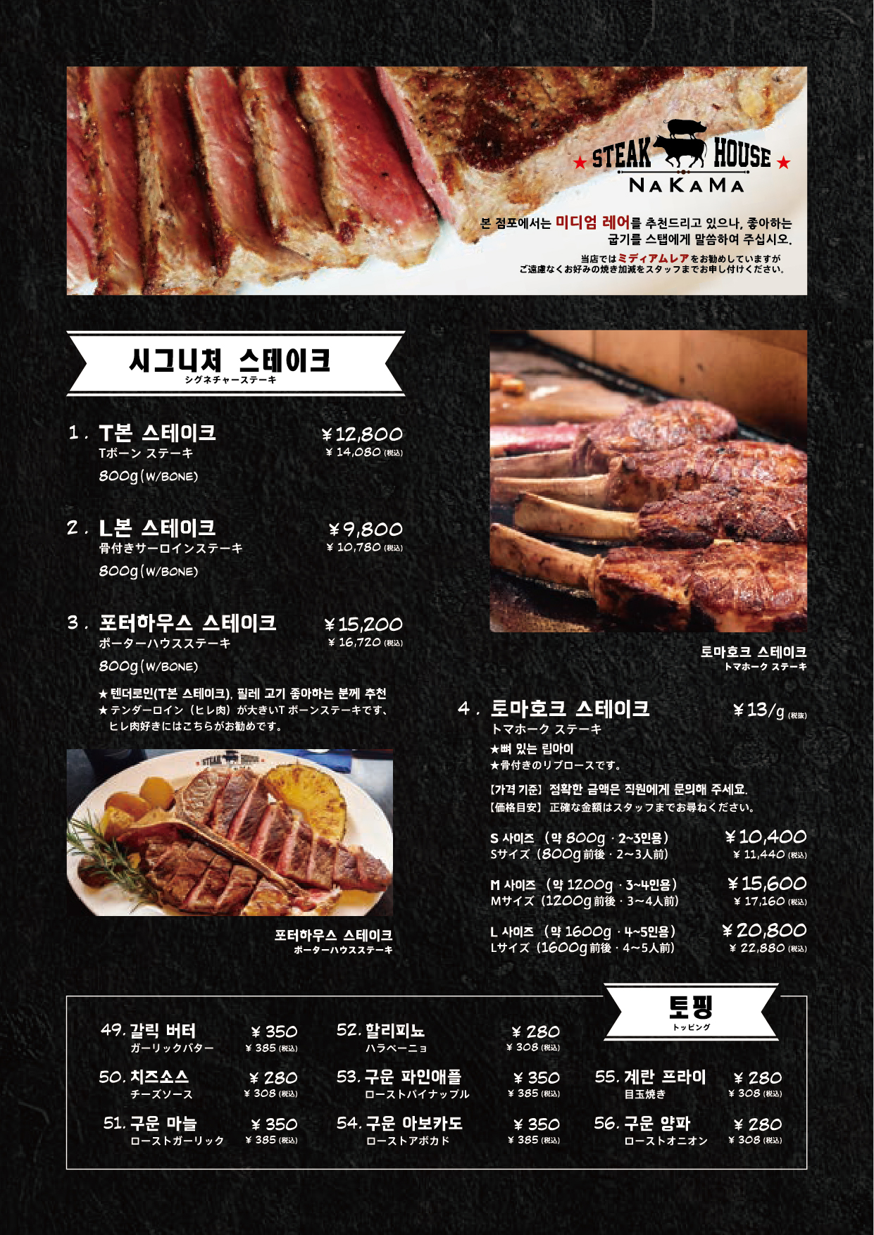 미국식 분위기를 자아내는 이곳에서는 특제 1파운드 두께의 스테이크는 물론, 푸짐한 티본 스테이크와 토마호크 스테이크를 즐기실 수 있습니다.